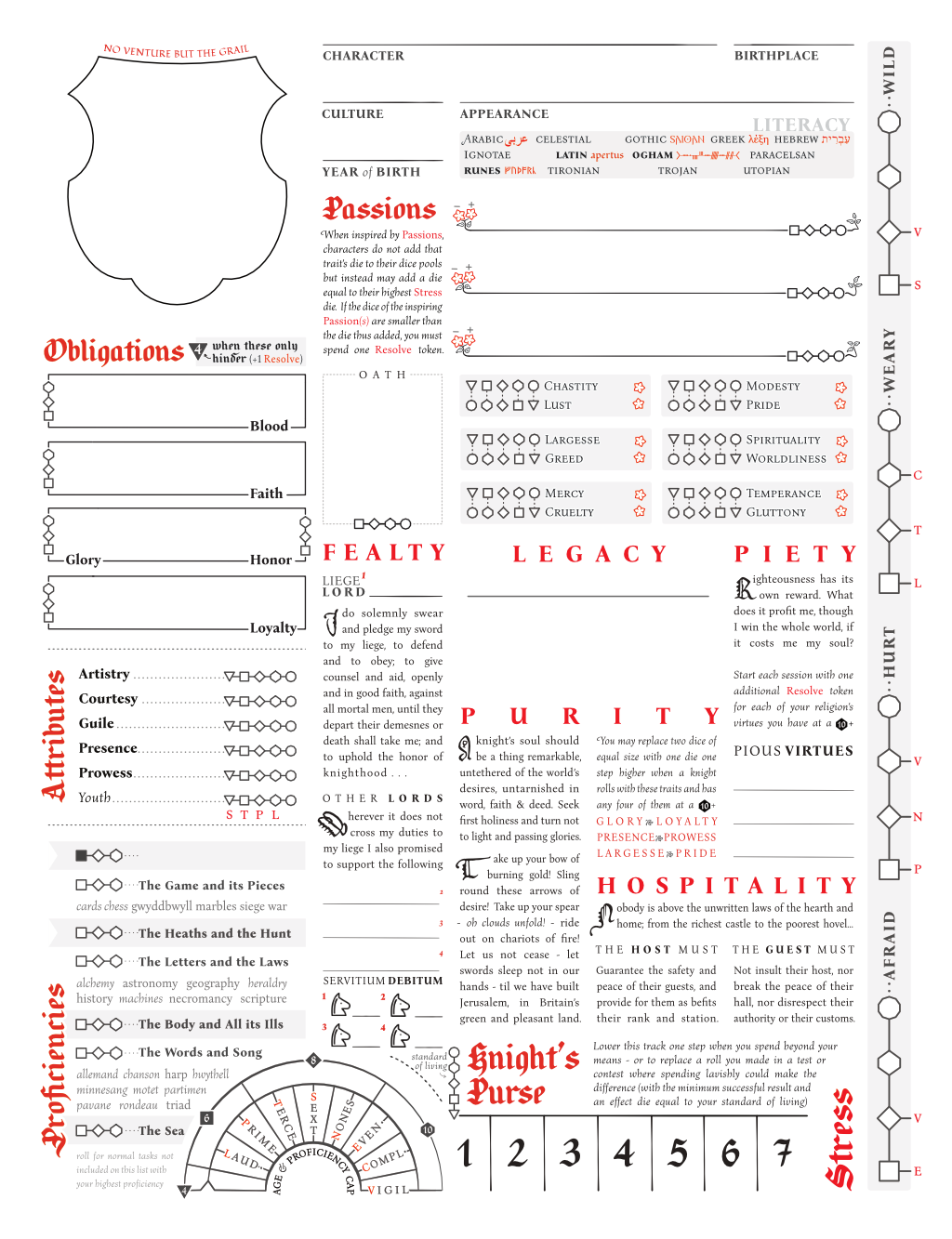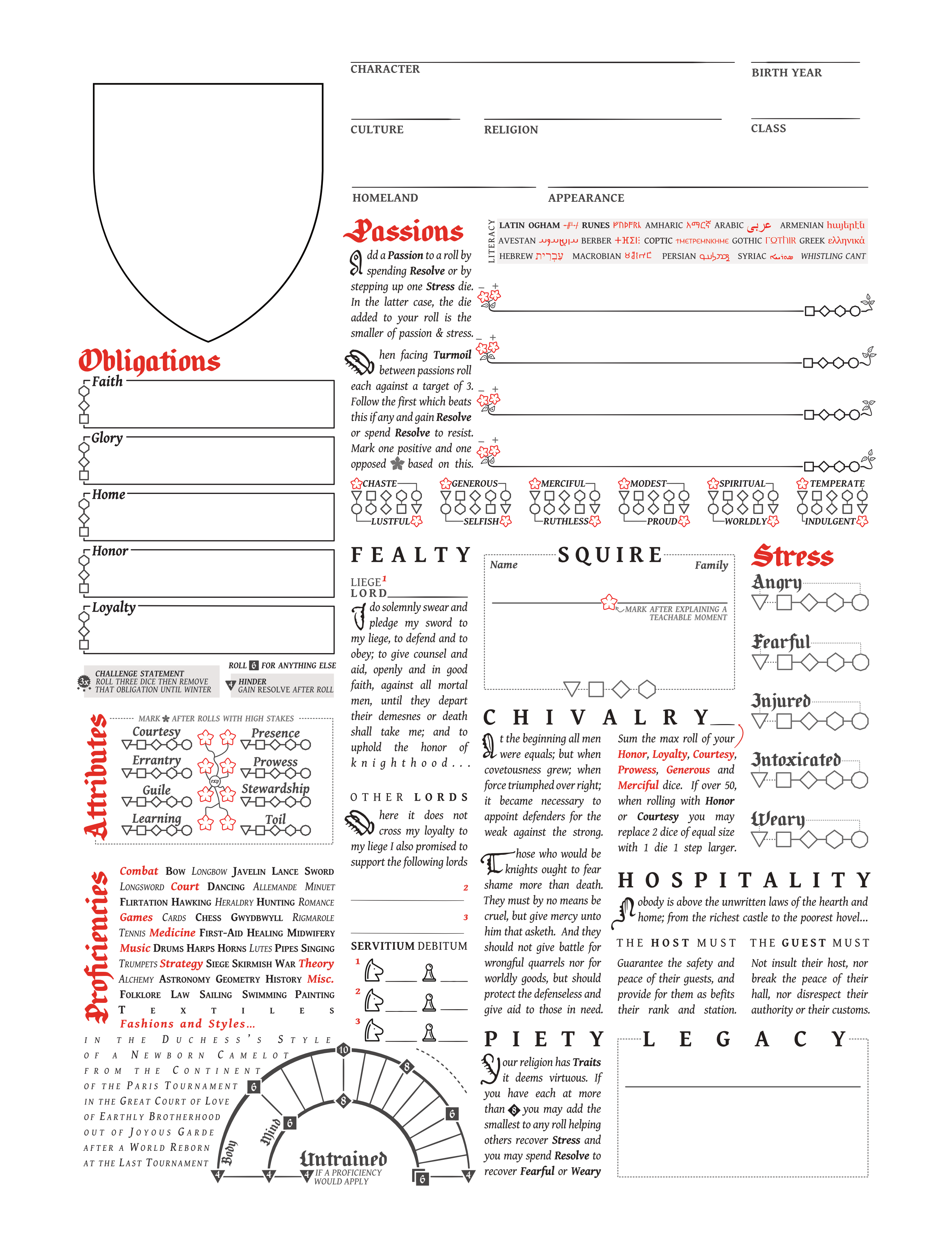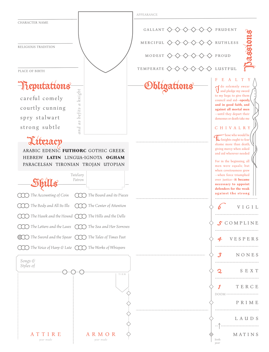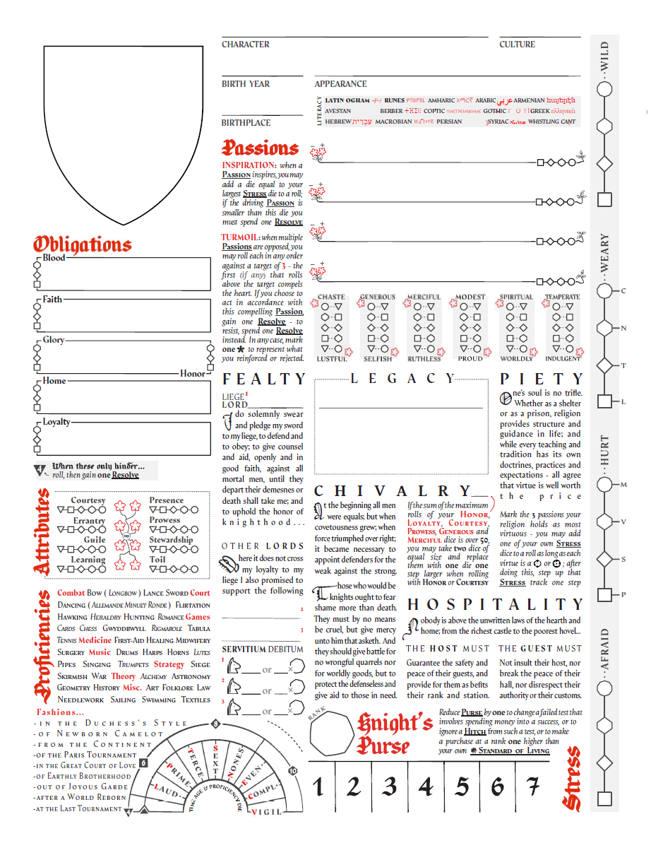 As standard Cortex, there’s three main trait sets - Obligations, Attributes (which maintains a lean towards the Pendragon style of leveling up skills) and Proficiencies (which have a shape that persisted in the character sheet for a long time - a little hidden Rota Fortunae motif).