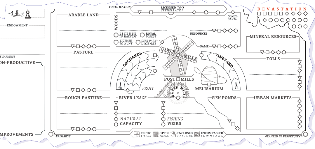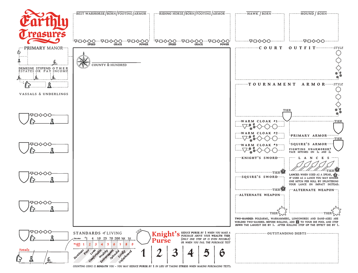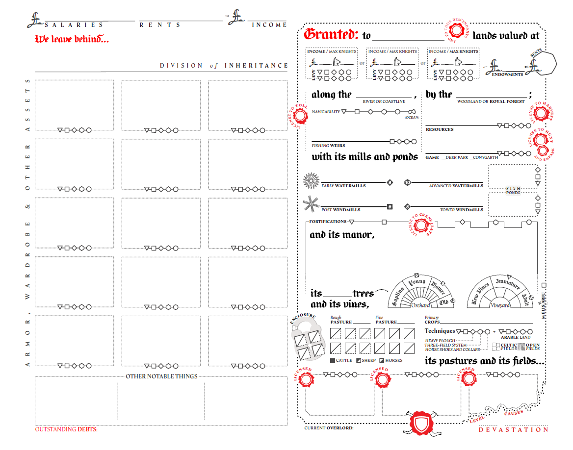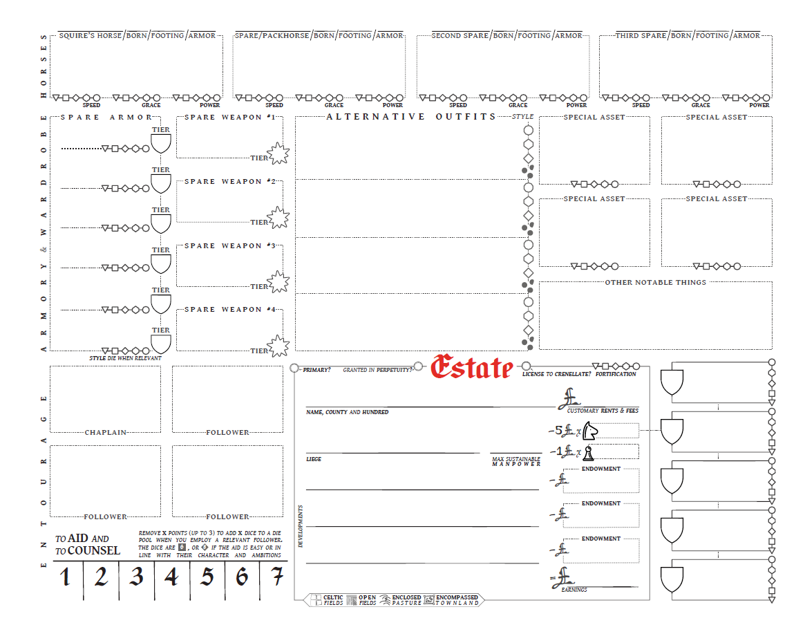 - Meanwhile, having an estate itself is visible on both sides of the sheet - including a big open place (a place to draw a map) on the front. Not all knights would have one, and I wanted it to feel “like a big hole in the heart that only land can satisfy” if that was empty.