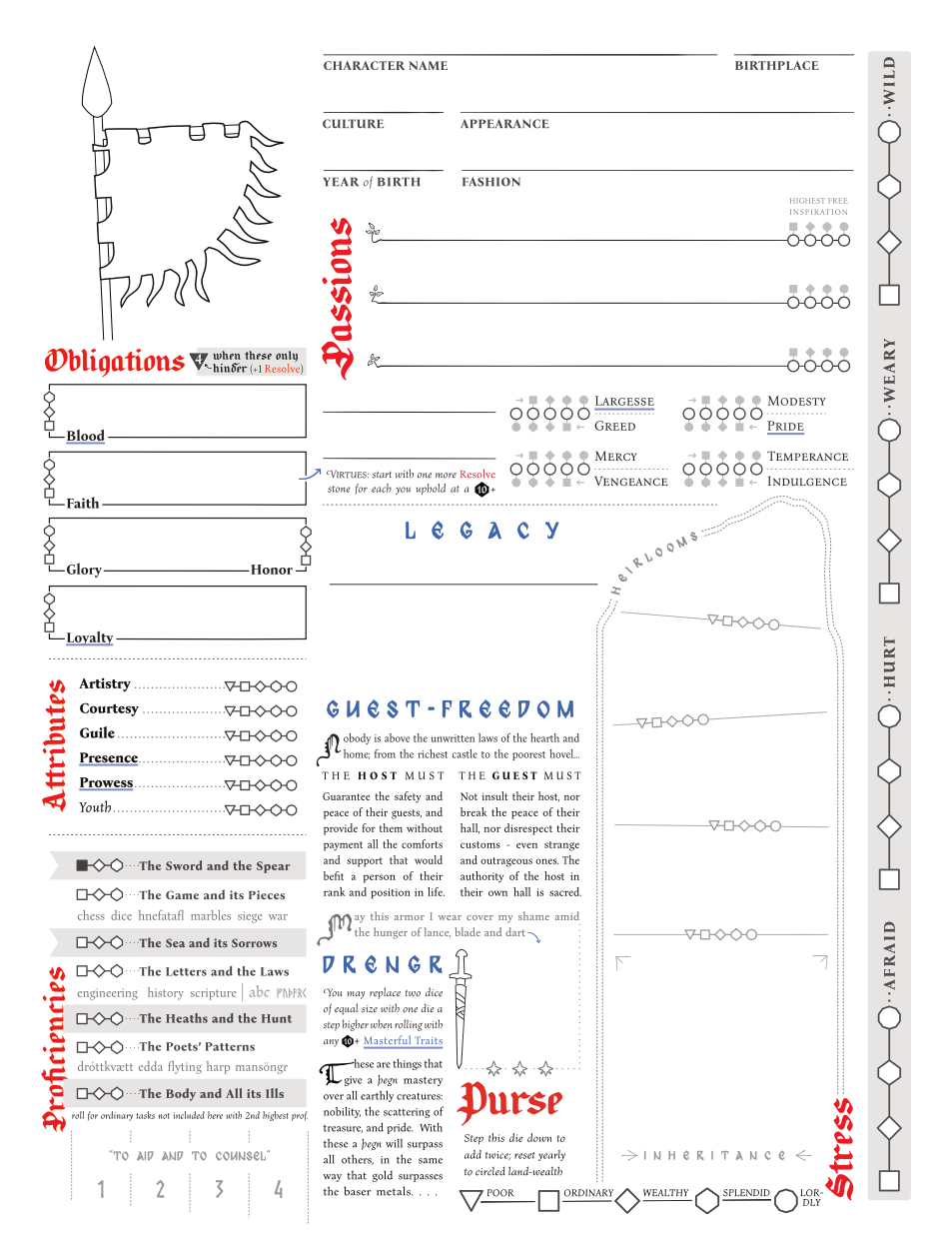 I should start with those as they’re a rather atypical part of a character sheet. I wanted to ground the players in the main assumptions taught to them from childhood. You shouldn’t forget your liege - the idealized goal of your class in society - your faith - the rules of hospitality - your family legacy14.